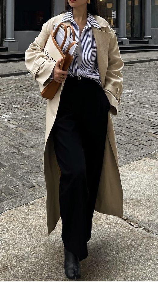 - 베이지 트렌치코트 + 블랙 머플러